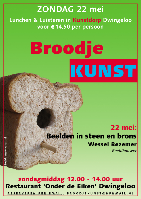 Ook na de zomervakantie zullen de initiatiefnemers van ‘Broodje Kunst’, eens in de maand op de zondagmiddag, lezingen organiseren met verschillende sprekers, boeiende onderwerpen over beeldende kunst en daaraan voorafgaande een lunch van biologische producten. Door sponsoring van Kunstbureau ‘Arteria’ en restaurant ‘Onder de Eiken’ kon de toegangsprijs inclusief lunch, op € 14,50 per keer gehouden worden.