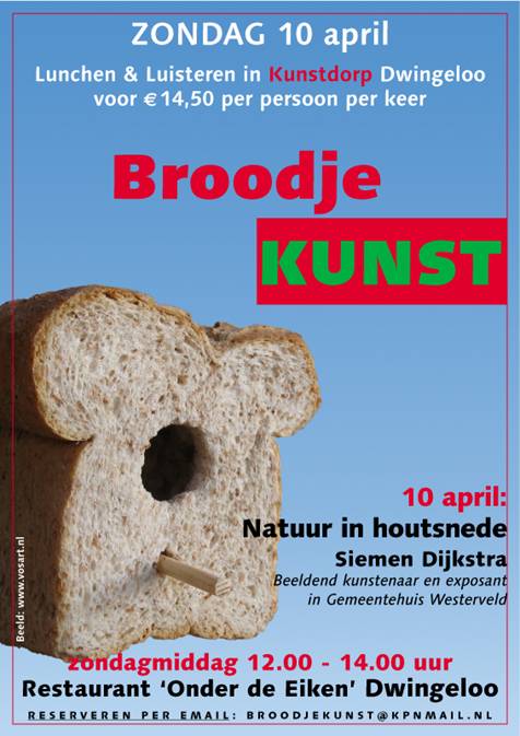 Siemen Dijkstra, beeldend kunstenaar te Dwingeloo en exposant in het Gemeentehuis van Westerveld, zal op zondag 10 april het spits afbijten en zijn specialisme gedetailleerd toelichten onder de titel ‘Natuur in houtsnede’. Voorafgaande aan de lezing kan men in een kunstzinnige sfeer een lunch gebruiken, samengesteld uit biologische producten. Dit steeds aangevuld met kunstbeschouwing door sprekers van nationale autoriteit geeft deze maandelijkse zondagmiddag extra kleur.
